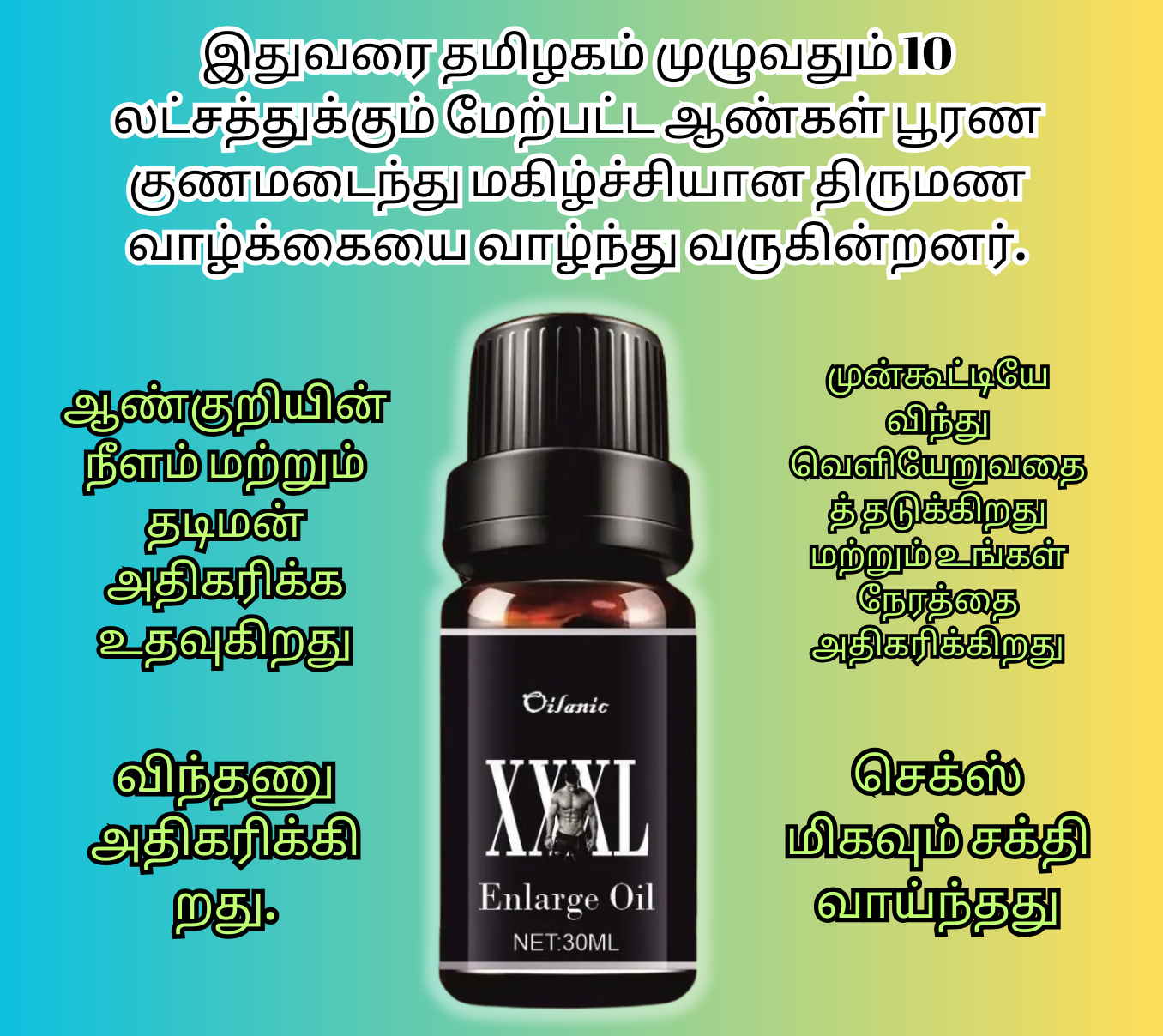 மில்லியன் கணக்கான திருப்தியான வாடிக்கையாளர்கள் தினசரி Enlarge Oil ஐப் பயன்படுத்துகின்றனர் . Enlarge Oil என்பது இந்திய சந்தையில் அதிகம் விற்பனையாகும் மூலிகை ஆயுர்வேத மருந்து ஆகும், இது இயற்கையாகவே ஆண்களின் பாலின ஆற்றலை ஆரோக்கியத்திற்கு தீங்கு அல்லது பக்க விளைவு இல்லாமல் அதிகரிக்கிறது.